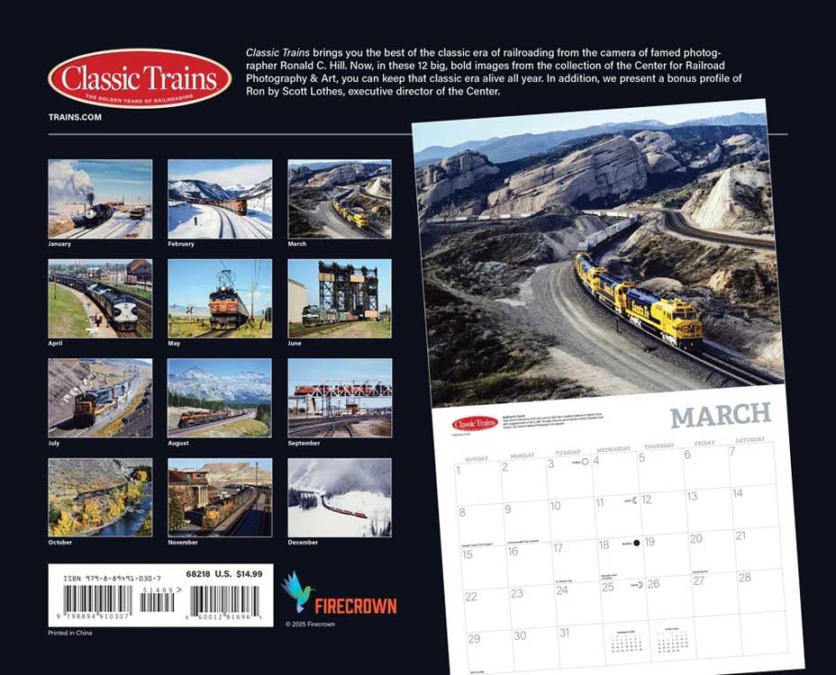 The 2026 Classic Trains Magazine Calendar from Firecrown features 12 historic railroad photos along with all the dates, anniversaries, and features you've come to know and love from our calendars. Classic Trains brings you the best of the classic era of railroading from the camera of famed photographer Ronald C. Hill. Now, in these 12 big, bold images from the collection of the Center for Railroading Photography & Art, you can keep that classic era alive all year. In addition, we present a bonus profile of Ron by Scott Lothes, executive director of the Center. National holidays and occasions are highlighted, and there is ample room to add notes and appointment reminders. The Classic Trains Magazine 12-month calendar is a great addition to your train room or office!