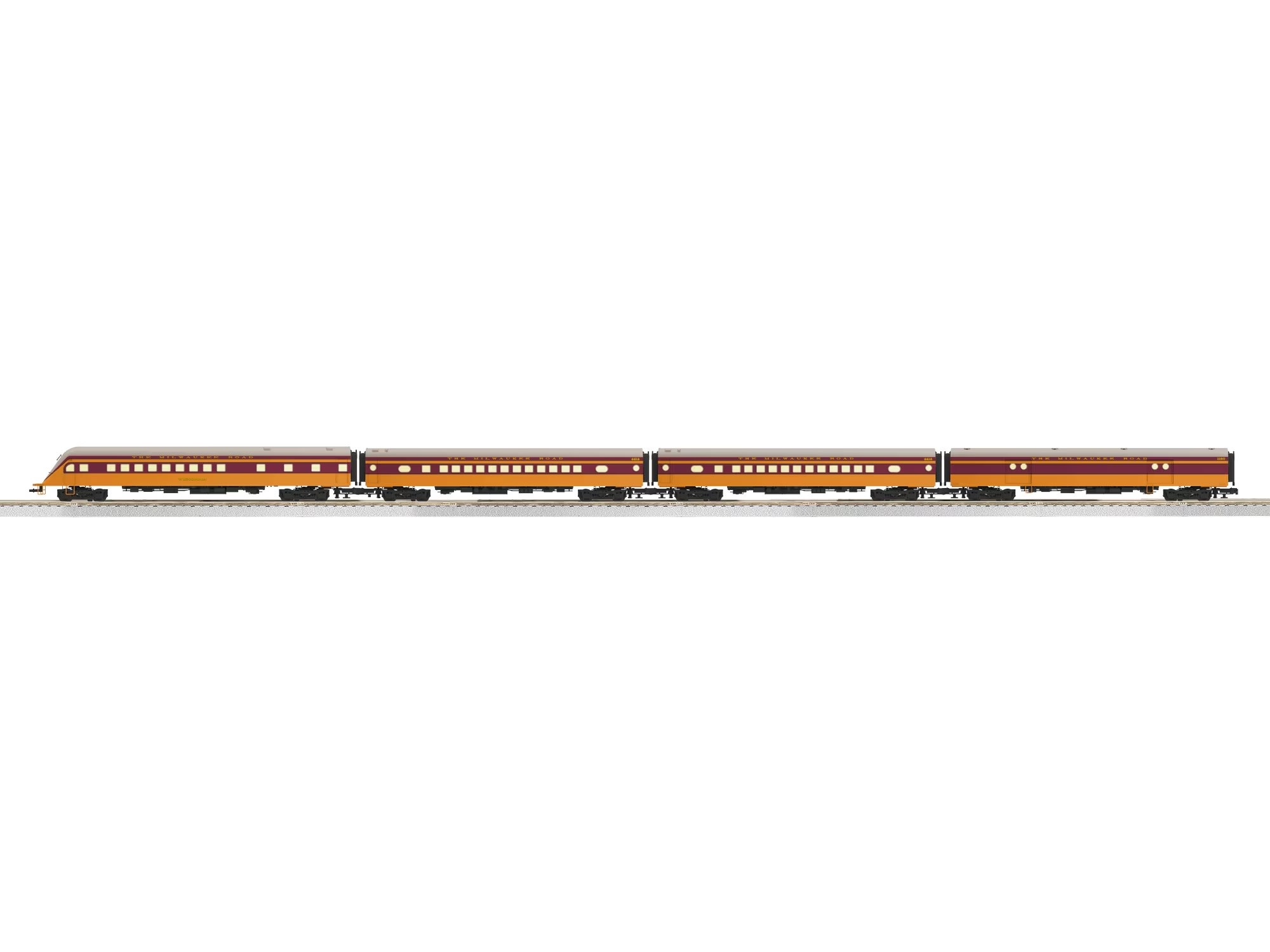 Built in 1935, Milwaukee's new streamlined Hiawatha passenger trains became an immediate success on the highly competitive Chicago-Twin Cities route. With new, home-built passenger trains to complement the streamlined Atlantics, the Hiawatha's often ran in multiple sections to satisfy demand. As the years went on, Hiawatha service spread to different routes. Much of the original equipment survived with some decorative and structural modification for decades. To accompany the return of our LEGACY Milwaukee Road Class A Atlantics, we're bringing back matching 18" aluminum-bodied passenger cars. These cars, with different details than those last offered in 2006 to better reflect the 1935-42 versions of the Hiawatha, feature aluminum bodies, die-cast trucks, and detailed LED-illuminated interiors with figures. The first aluminum-bodied passenger cars in the Lionel catalog in almost a decade, we think fans of these cars will be very pleased to see their return! We've added our StationSounds diner features to the observation car in the 4 pack so that we can also include the air horn! Though there can only be one "Hiawatha," the Class As inspired similar streamlining efforts on other railroads and we've taken the liberty to offer some "what-if" sister trains on other railroads as well.