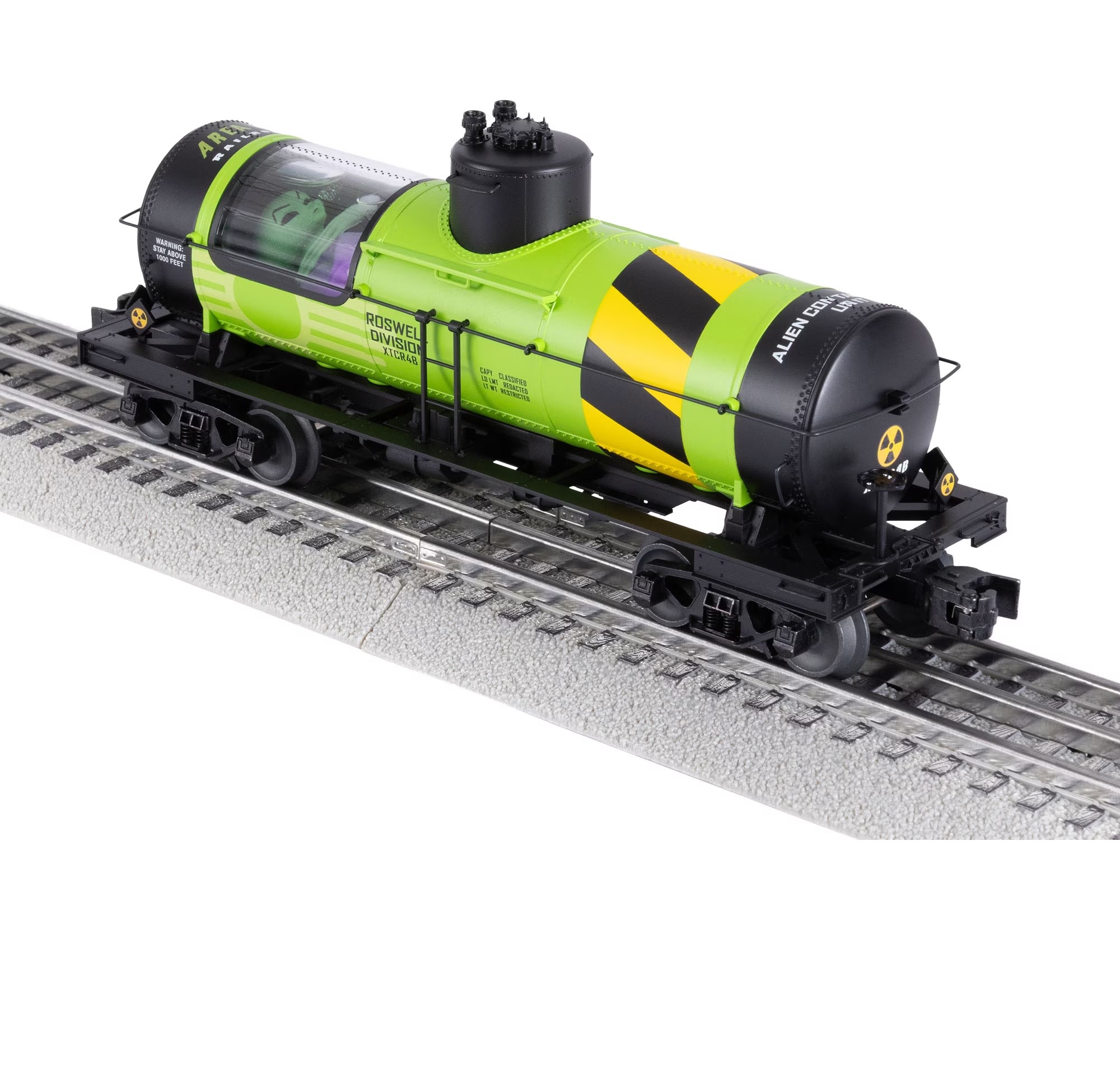 Our Area 51 rolling stock and accessories provide out of this world fun for scale or traditional layouts! These fun new scale rolling stock pieces include a hotbox "cryogenic transport unit", a glowing heavy duty flatcar carrying who-knows-what and another transport unit that the government has left surprisingly open for viewing! The tank car window reveals a large alien in protective fluid within. His partner isn't faring as well in our Area 51 Tank car accident accessory, complete with additional figures and a glowing spill. You can even add more life to your layout with additional new figures available separately.