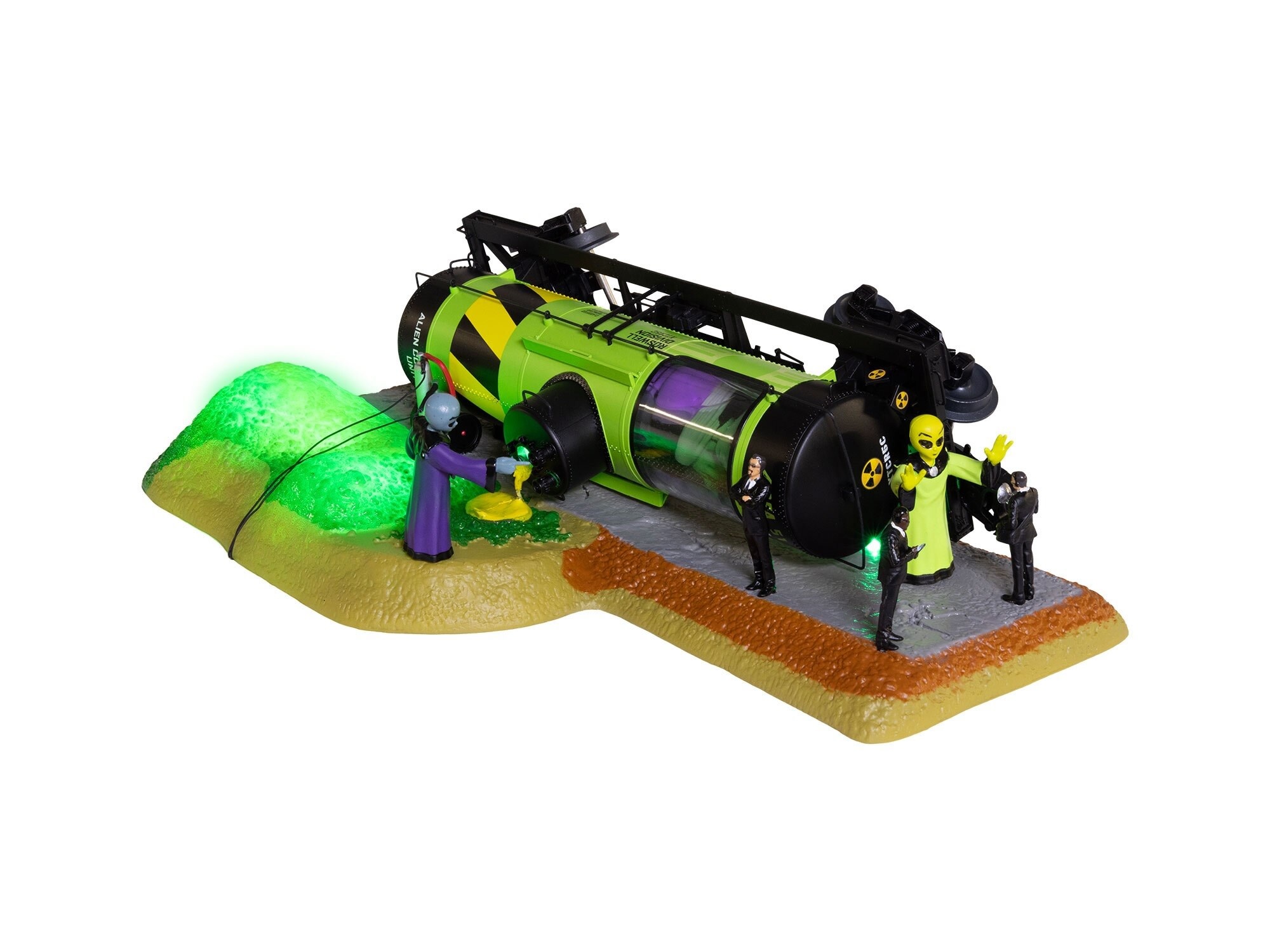 Our Area 51 rolling stock and accessories provide out-of-this-world fun for scale or traditional layouts! These fun new scale rolling stock pieces include a hotbox "cryogenic transport unit", a glowing heavy duty flatcar carrying who-knows-what and another transport unit that the government has left surprisingly open for viewing! The tank car window reveals a large alien in protective fluid within. His partner isn't faring as well in our Area 51 Tank car accident accessory, complete with additional figures and a glowing spill. You can even add more life to your layout with additional new figures available separately.