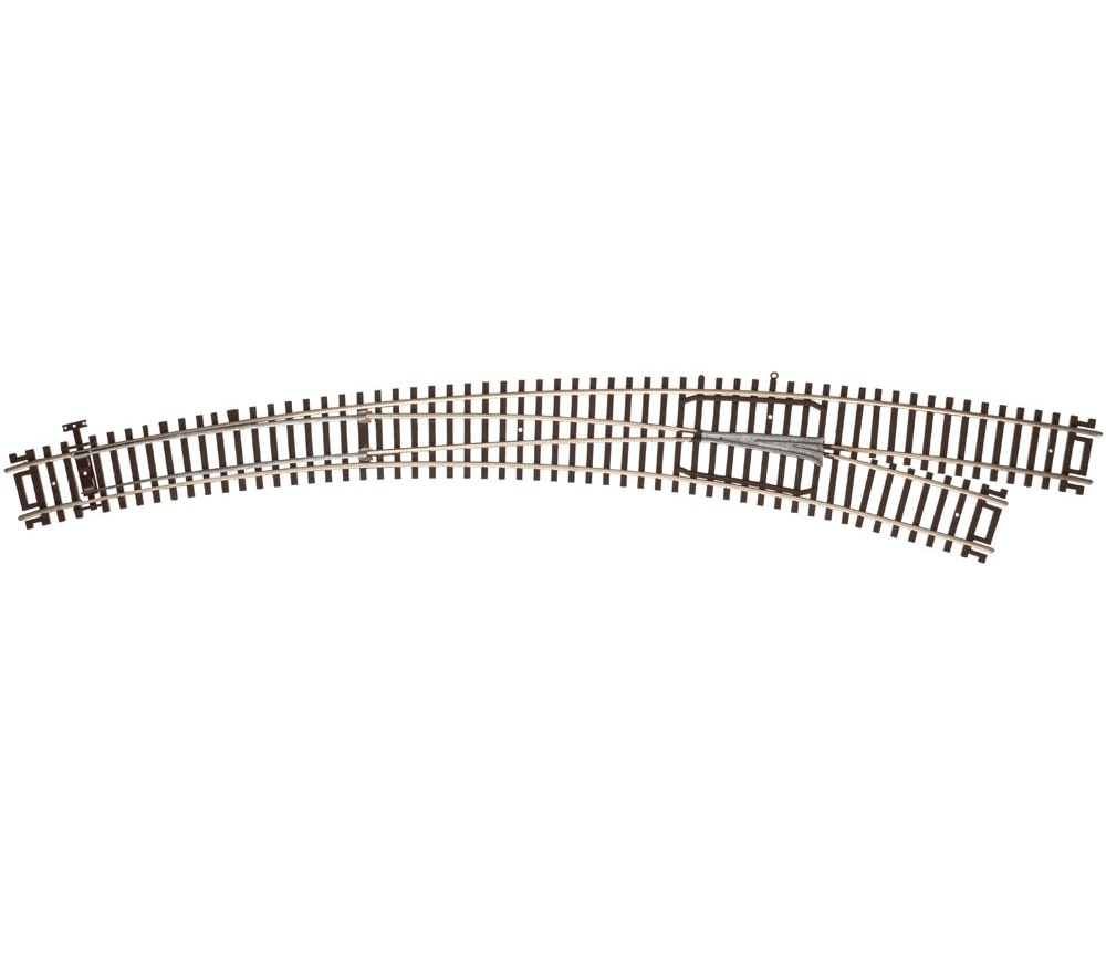 This Atlas Code 83 Customline Curved Turnout features nickel silver rail and brown plastic ties that match other Atlas Code 83 trackage. This turnout can be set up as a remote or manual switch with your choice of switch machine (sold separately). The turnout also features die-cast points and an isolated, die-cast metal frog with a power contact. You can use this power contact option to energize the frog and prevent loss of power when a locomotive is passing through. The outside radius of the Code 83 Curved Turnout is 30" and the inside radius is 22".