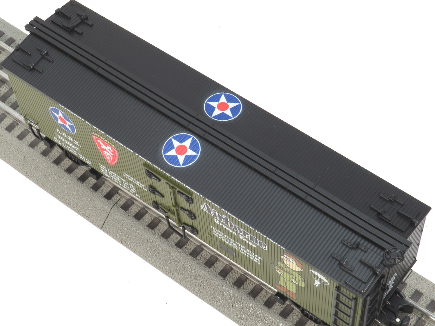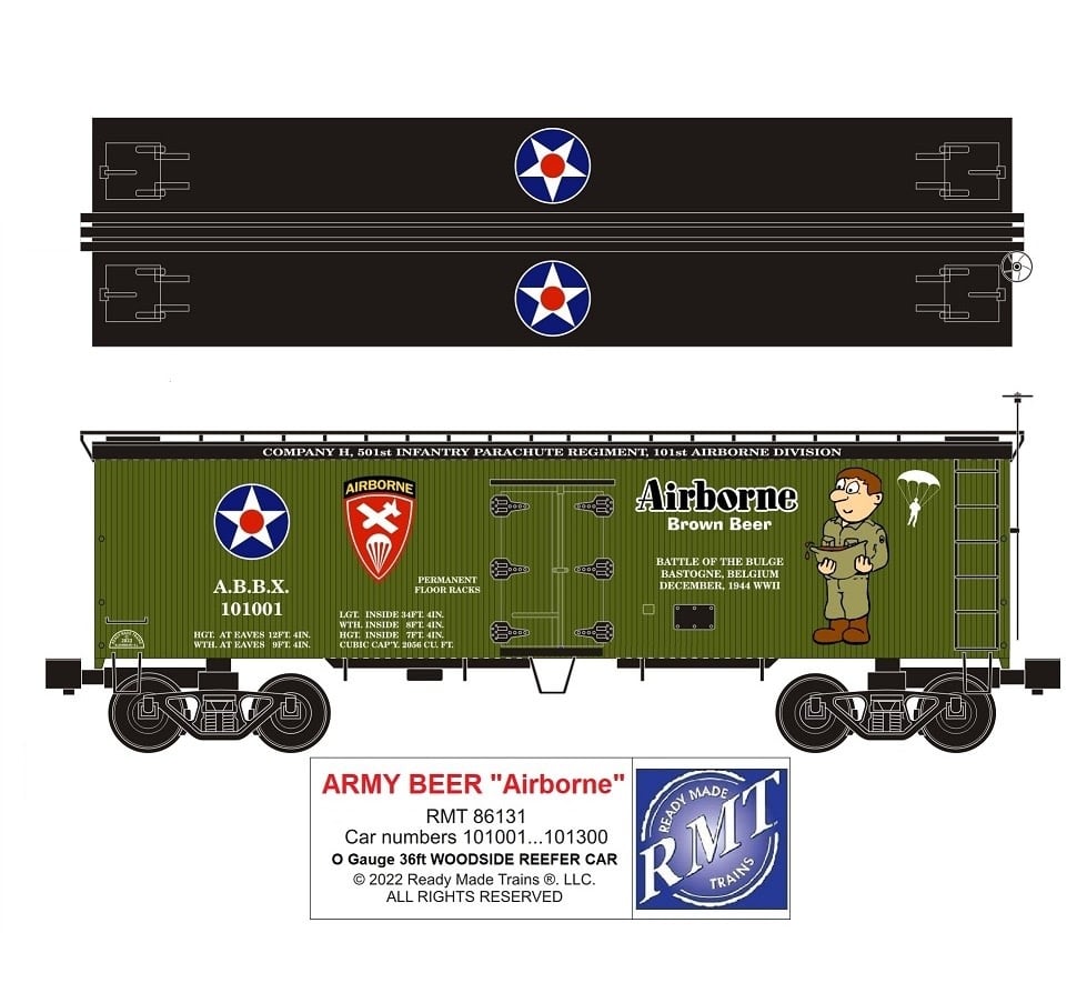 The Ready Made Trains AIRBORNE BEER 36ft wood side reefer car is painted in original US ARMY olive drab green.