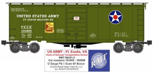 This US ARMY boxcar recognizes the ARMY's Railroad Transportation School at Ft. Eustis, VA where military railroaders were trained in all facets of railroading on an actual operating base railroad. The base currently features an interesting transportation museum of steam and diesel locomotives with freight and passenger equipment that actually operated here.