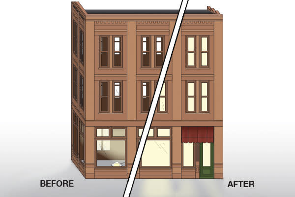 Blocks outside view through the windows of an empty building, while still allowing light to shine through the windows from the inside.