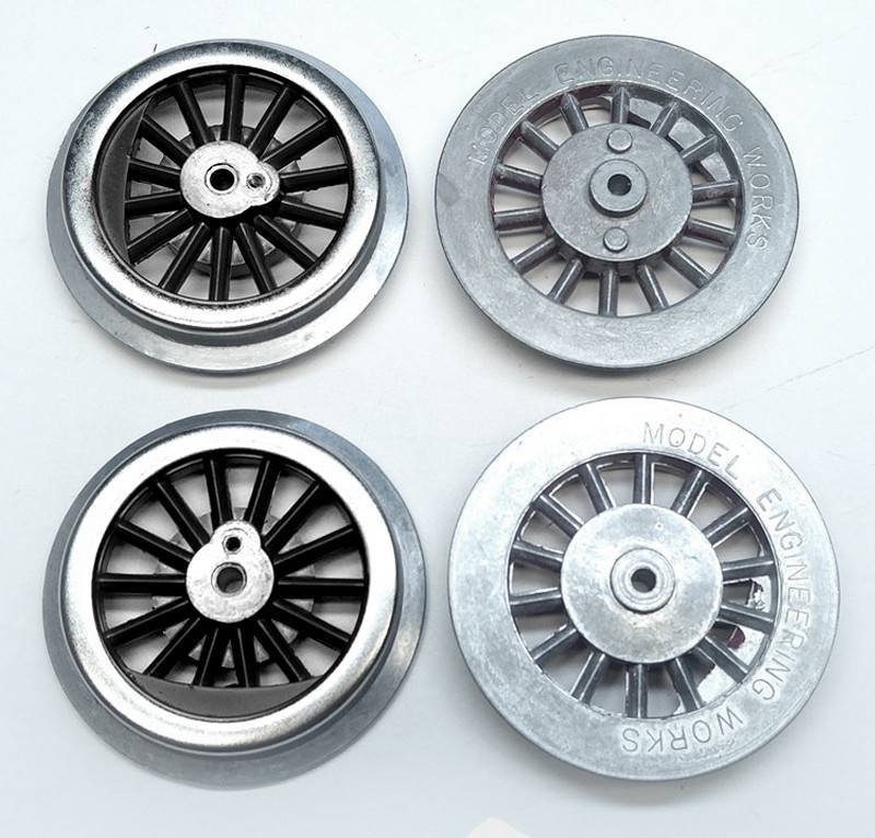 This is a new set of four (4) Model Engineering Works Standard Gauge locomotive wheels with black spokes for the 384 & 390 steam locomotives. 4:36 tapped, Rod screw.
