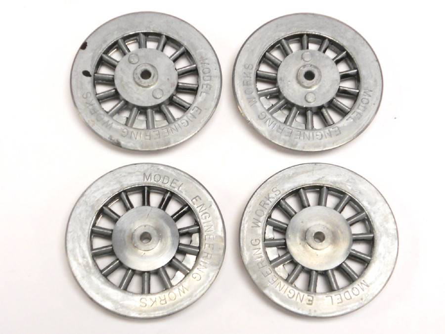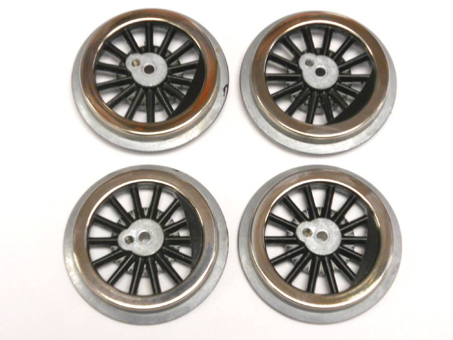 This is a set of four (4) Model Engineering Works Standard Gauge steam locomotive wheels with black spokes that will fit the 385, 392, 400 and 1835 Lionel standard gauge steam locomotives. 8:32 tapped.